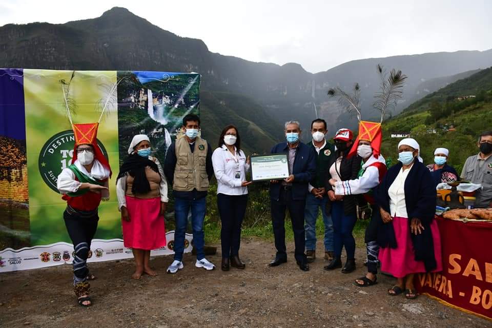 Mery Claudina Fernández Díaz, representante del Mincetur, y Directora de Productos y Destinos Turísticos, realizó la entrega oficial del sello TOP 100 GREEN DESTINATION al destino Kuélap – Gocta, el galardón fue recibido por el gobernador regional de Amazonas, Óscar Altamirano Quispe en el centro poblado de Cocachimba.